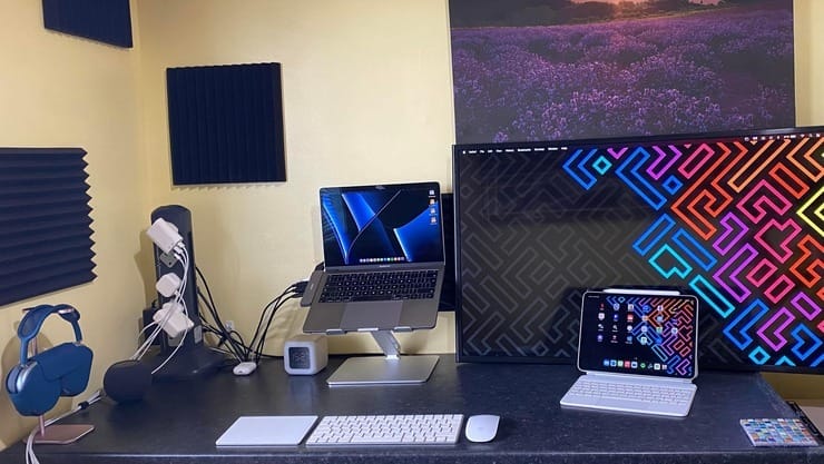 Some people care deeply about cable management, with nary a cord to be seen in their computer setups. Others couldn’t care less about it, leaving wire-spaghetti all over the place. And folks in the middle want to do it right, but meh, maybe next week, and maybe only somewhat. Today’s featured MacBook Pro and iPad Pro setup stakes out much of the ground described above. Cable management is in play, but it’s done in a way that drove some neatniks crazy (while others applauded the controlled mayhem).