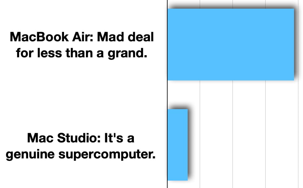 And, as they say, Apple is just getting started. Take the benchmarks for the new MacBook Air, which is 50% faster than last year’s model — a pretty remarkable boost.
