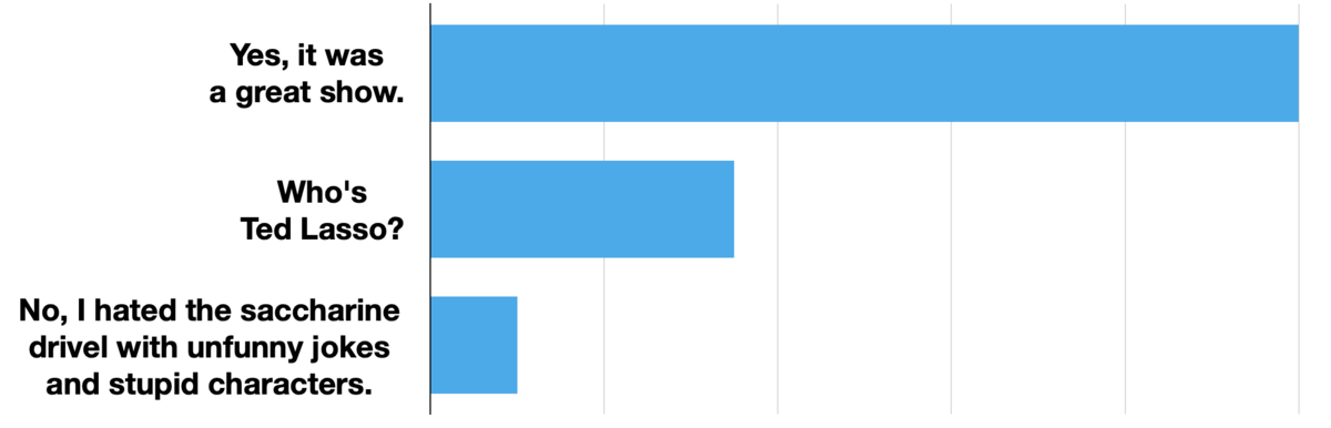 Unlike me, most of this newsletter’s readers love Ted Lasso and are sad to see the end of the hit show — see the poll results below. (Good riddance, I say!)